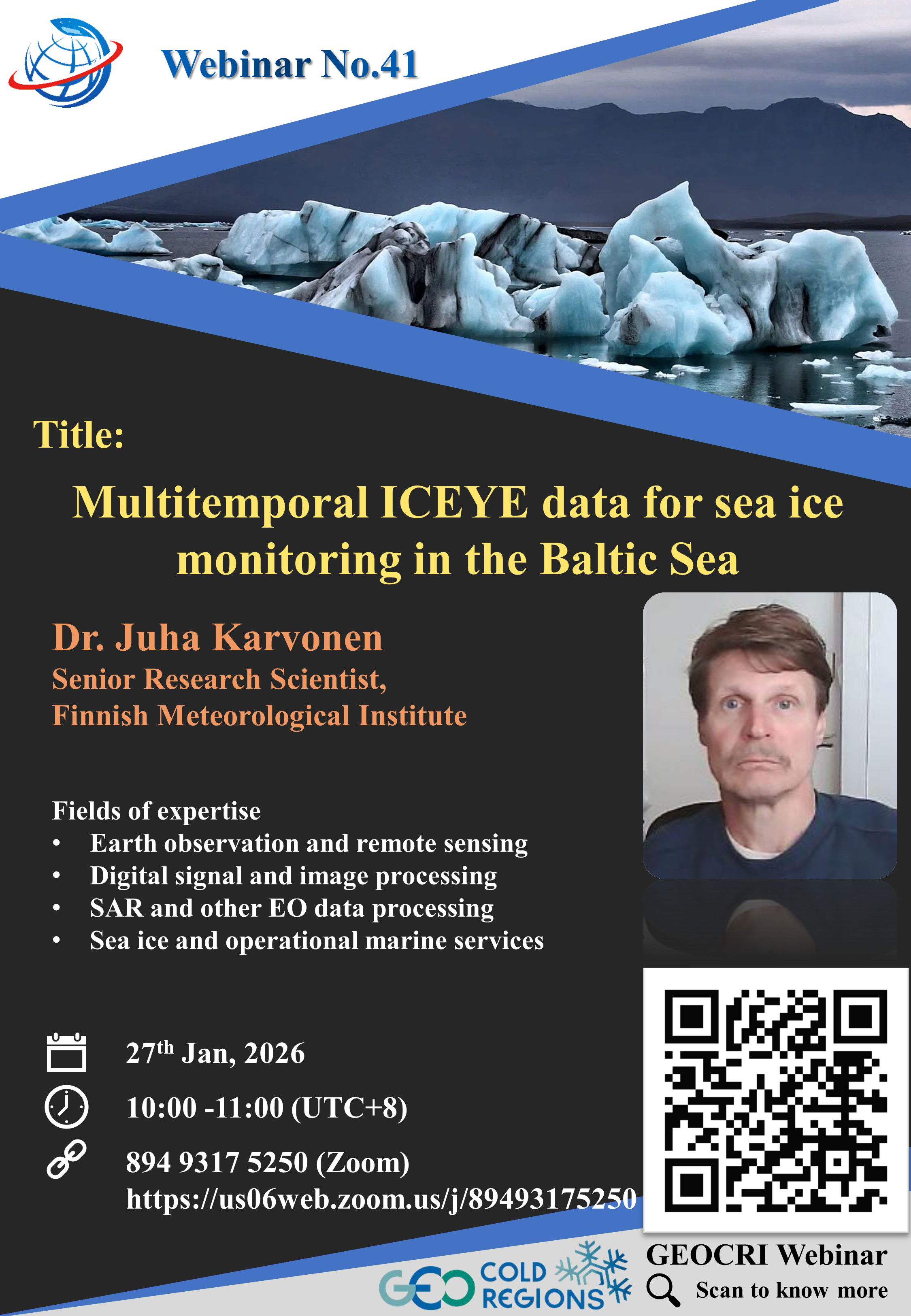 Welcome to the GEOCRI Webinar, hosted under the GEO Cold Regions Initiative. This webinar, titled "Multitemporal ICEYE data for sea ice monitoring in the Baltic Sea," will explore innovative applications of ICEYE's multitemporal data capabilities in monitoring and understanding sea ice dynamics within the Baltic Sea region. Join us for this enlightening seminar where experts will share insights, methodologies, and real-world applications, aiming to advance our knowledge in cold regions monitoring.