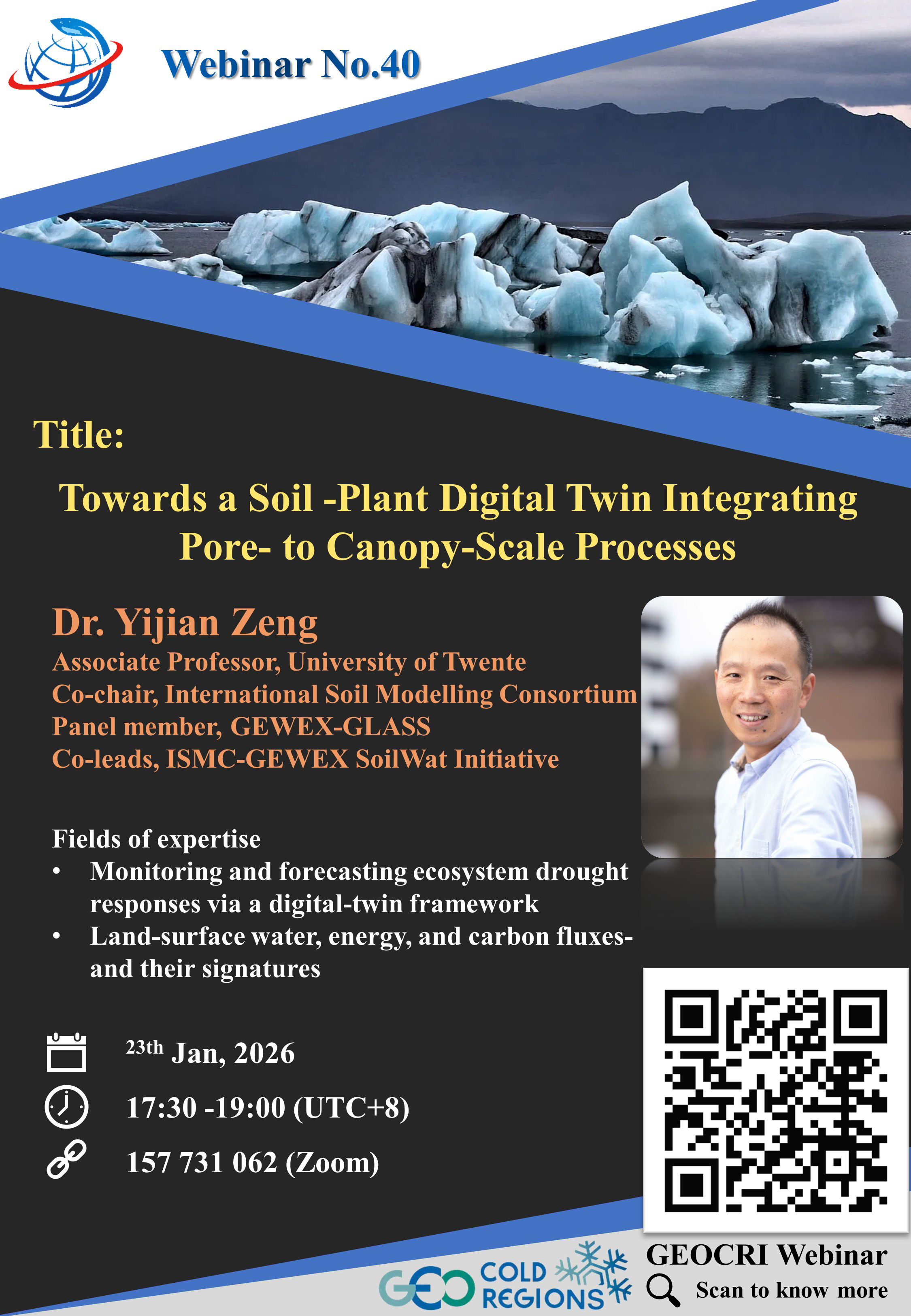 Welcome to the GEOCRI Webinar section of our website, the GEO Cold Regions Initiative. Here, we proudly present an engaging and transformative event titled 'GEOCRI Webinar: Towards a Soil-Plant Digital Twin Integrating Pore- to Canopy-Scale Processes.' This interactive webinar aims to delve into the intricate dynamics and integration of ecological processes from micro to macro scales in the context of cold regions. Join us to explore groundbreaking research and insights from leading experts in the field.